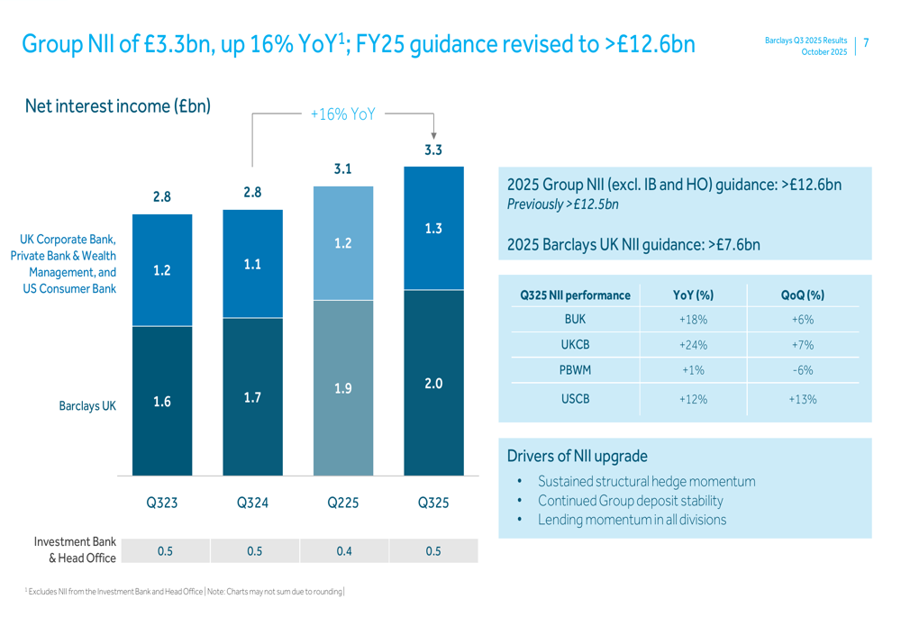 Net Interest Income (NII) showed particularly strong growth, increasing by 16% year-over-year to £3.3 billion. Based on this performance, Barclays upgraded its 2025 Group NII guidance (excluding Investment Bank and Head Office) to over £12.6 billion, previously over £12.5 billion. The NII growth was driven by strong performance across most divisions: