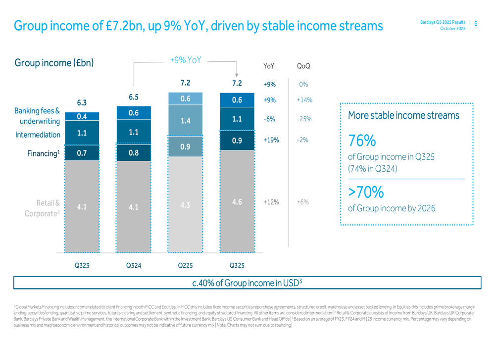 Group income increased by 9% year-over-year to £7.2 billion, with 76% coming from stable income streams, up from 74% in Q3 2024. The bank continues to benefit from its diversified business model, as shown in the income breakdown:
