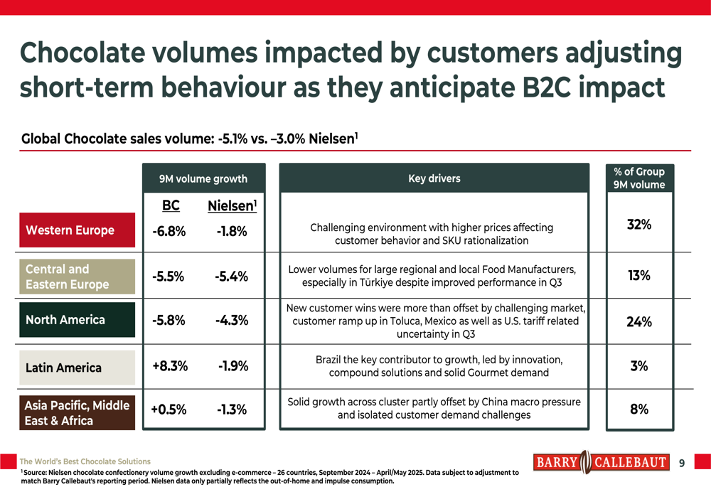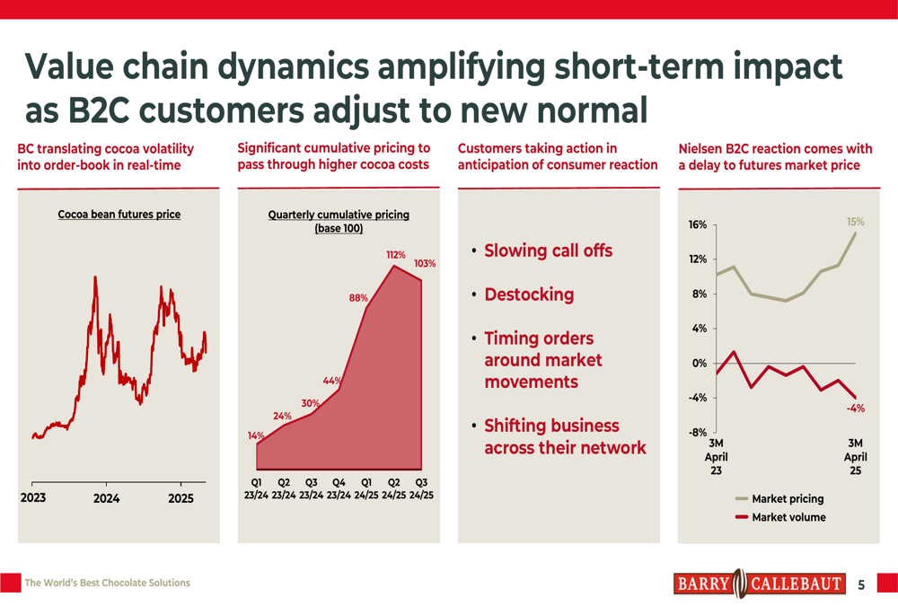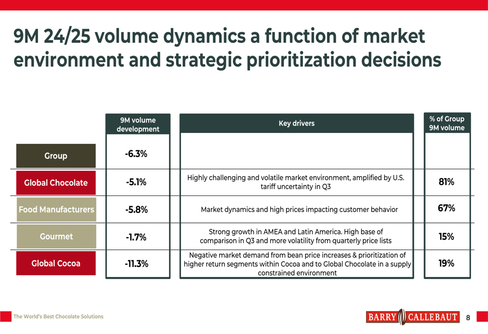 The company attributed volume declines to several factors, including U.S. tariff uncertainty, changing customer behavior in response to higher prices, and strategic prioritization in the cocoa segment. Customers have been adjusting their purchasing patterns by slowing call-offs, destocking, timing orders around market movements, and shifting business across their networks.