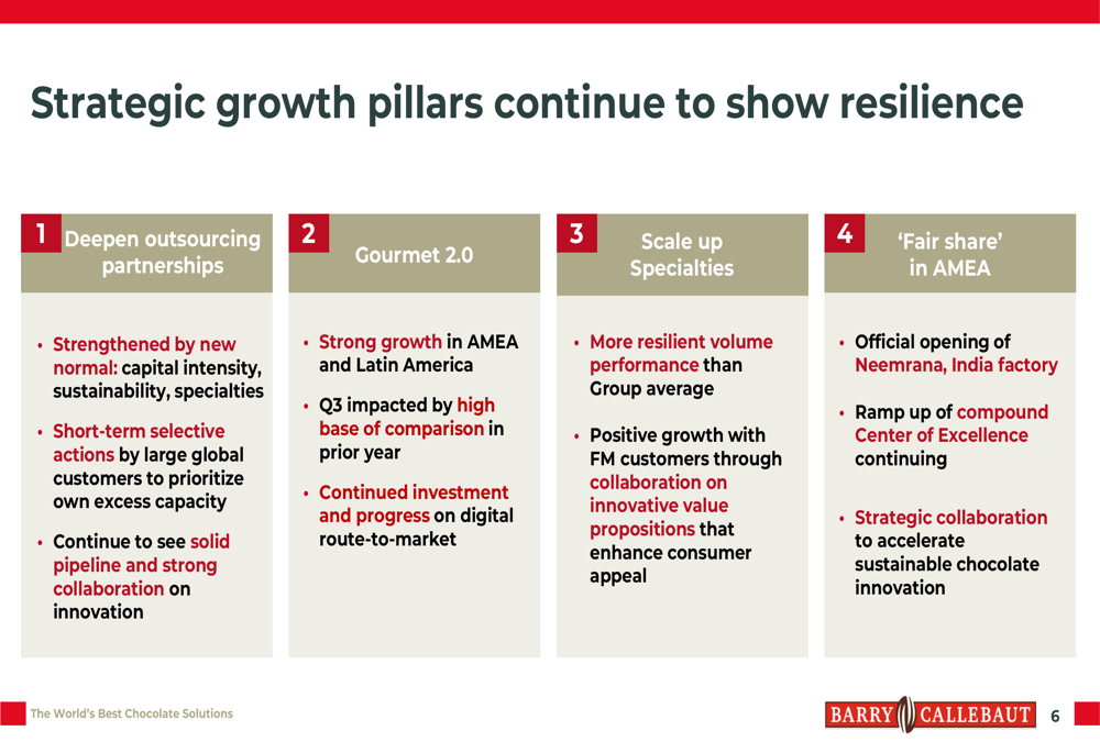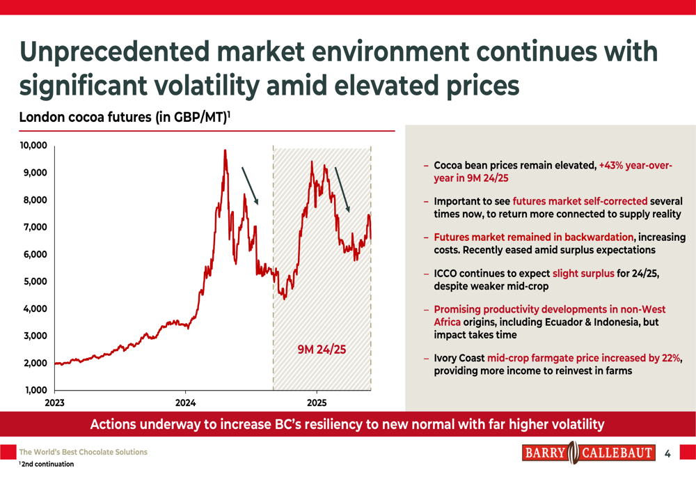 Barry Callebaut continues to leverage its cost-plus model to pass through significant cocoa price increases while prioritizing key growth pillars of outsourcing, gourmet, specialties, and expansion in Asia, Middle East, and Africa. The BC Next Level transformation program remains central to delivering better customer experiences while enhancing agility, scalability, and cost efficiency.