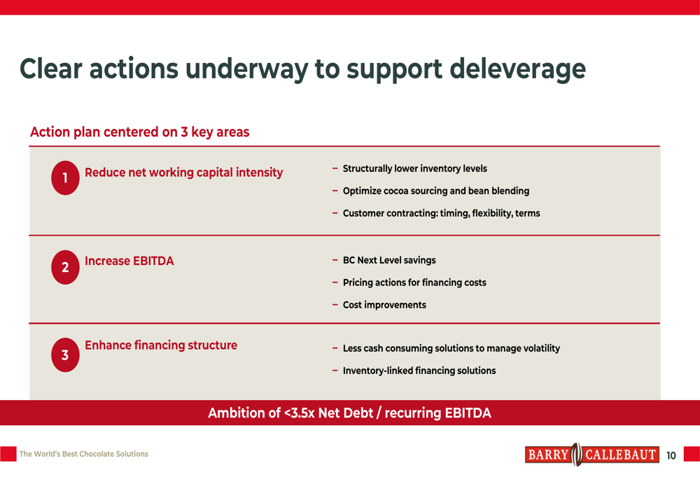 To address financial pressures from elevated cocoa prices, Barry Callebaut has implemented a comprehensive action plan focused on deleveraging. According to the earnings call transcript, the company aims to reduce its net debt/EBITDA ratio from the current 6.5x to below 3.5x through three key initiatives: