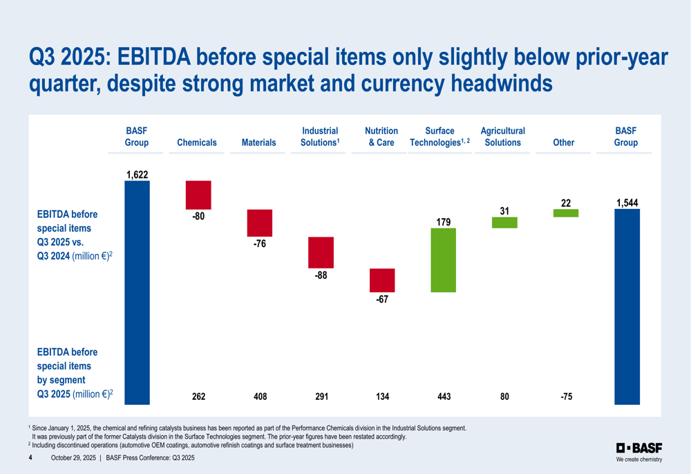 Excluding discontinued operations, BASF reported Q3 2025 sales of €14.33 billion, down 3.3% from the restated 2024 figure of €14.82 billion. EBITDA before special items on this basis was €1.43 billion, representing a 3.2% decline from the prior year. Net income fell significantly to €172 million, down 39.9% from €287 million in Q3 2024.
