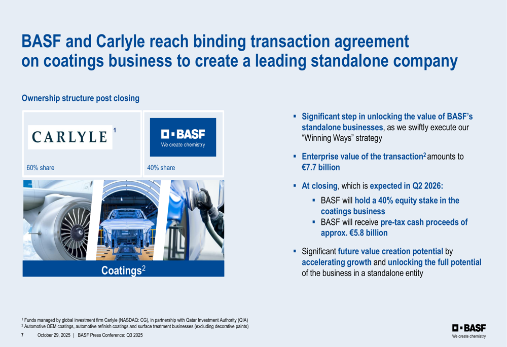 The most significant announcement in BASF’s presentation was the binding agreement with Carlyle regarding the company’s coatings business. This transaction, valued at €7.7 billion, represents a major step in BASF’s strategy to unlock value from its standalone businesses.