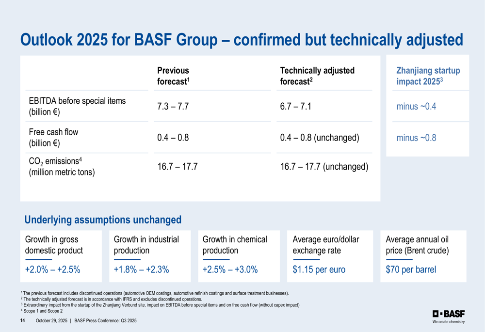 BASF maintained its adjusted outlook for 2025, projecting EBITDA before special items in the range of €6.7-7.1 billion, reflecting the technical adjustment for the coatings business classification as discontinued operations:
