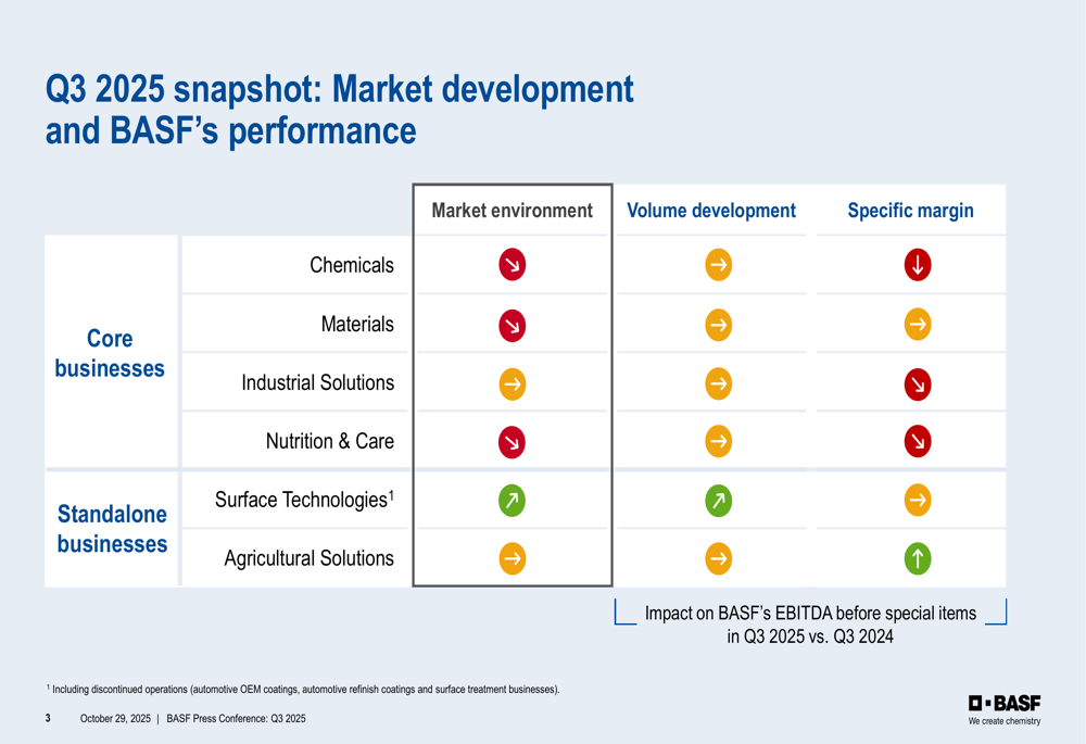 BASF’s Q3 2025 sales declined by 3.2% year-over-year, primarily due to negative currency effects (-3.9%) and lower prices (-1.7%), partially offset by volume growth of 1.5%. The company’s performance varied significantly across segments, with Surface Technologies and Agricultural Solutions showing strength while traditional chemical businesses faced pressure.