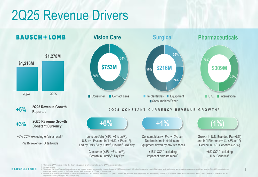 Bausch + Lomb reported total revenue of $1,278 million for Q2 2025, representing a 3% increase on a constant currency basis compared to Q2 2024. Excluding the impact of the enVista recall, constant currency revenue growth would have been 6%.