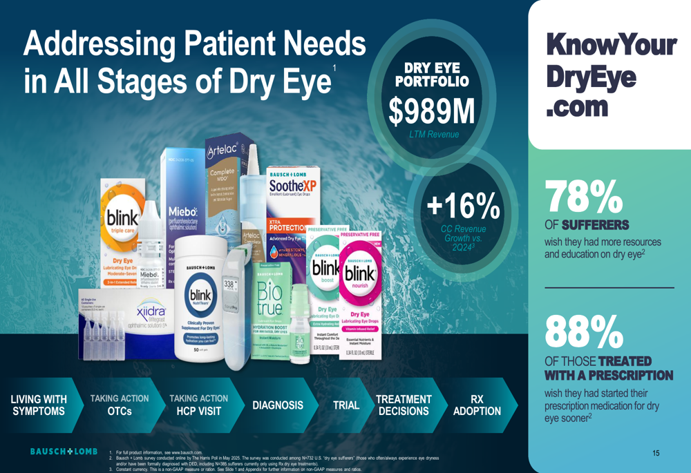 A significant highlight of Bausch + Lomb’s presentation was the strong performance of its dry eye portfolio, which generated $989 million in last twelve months revenue, growing 16% on a constant currency basis compared to Q2 2024.