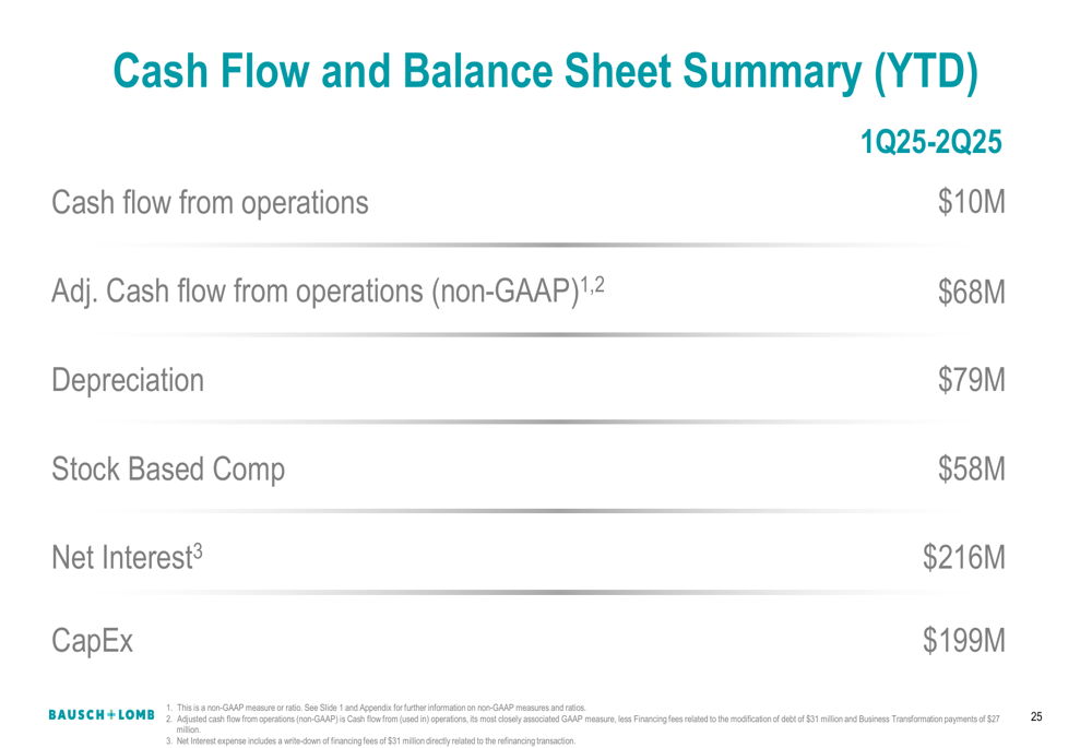 For Q2 2025, Bausch + Lomb reported cash flow from operations of $35 million and adjusted cash flow from operations of $86 million. Capital expenditures for the quarter were $89 million.