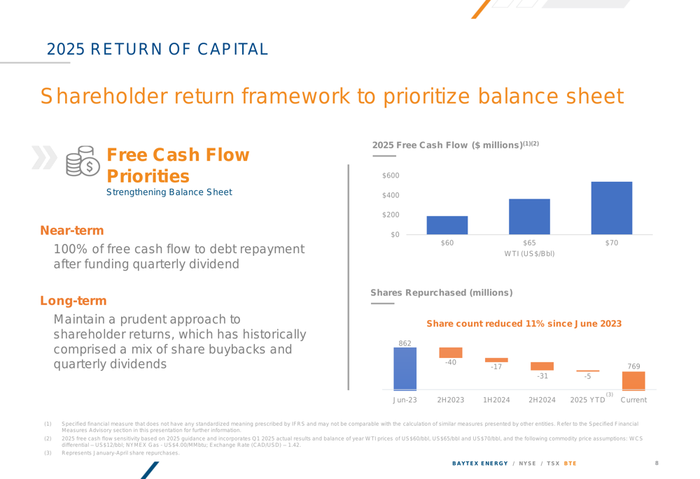 For shareholder returns, Baytex maintains an annual dividend of $0.09 per share (yielding 4.2% at current prices) and has repurchased 11% of its shares since June 2023. The company’s return of capital framework prioritizes balance sheet strength while providing sustainable returns to shareholders:
