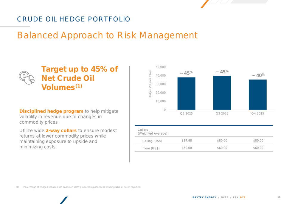 To manage commodity price risk, Baytex employs a balanced hedging strategy targeting up to 45% of net crude oil volumes: