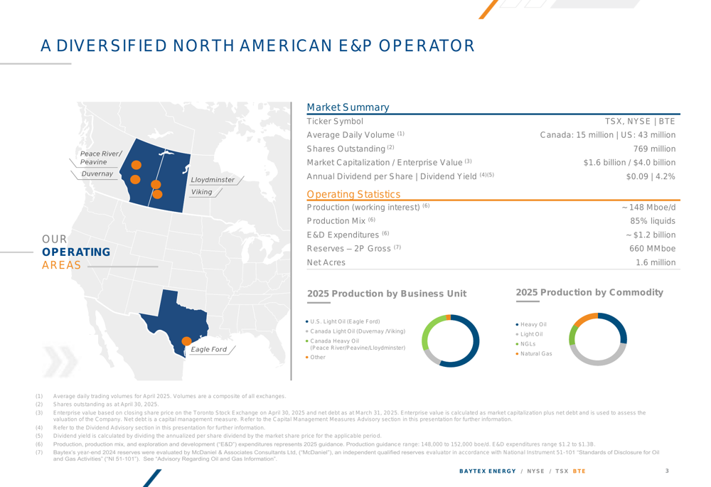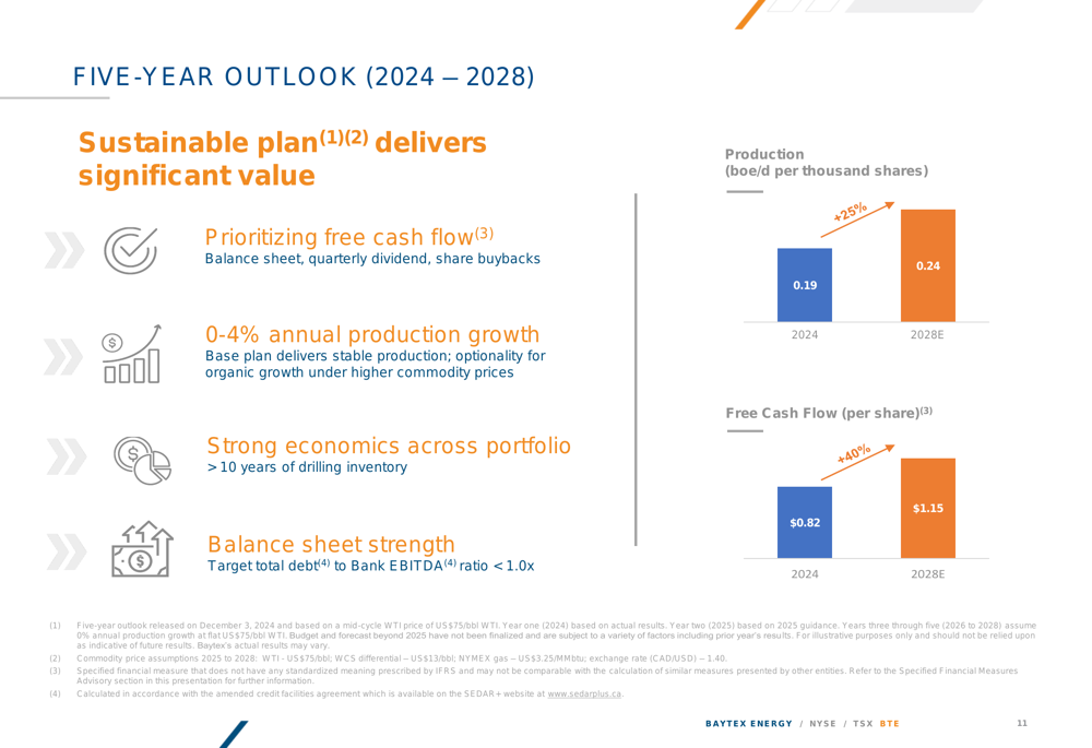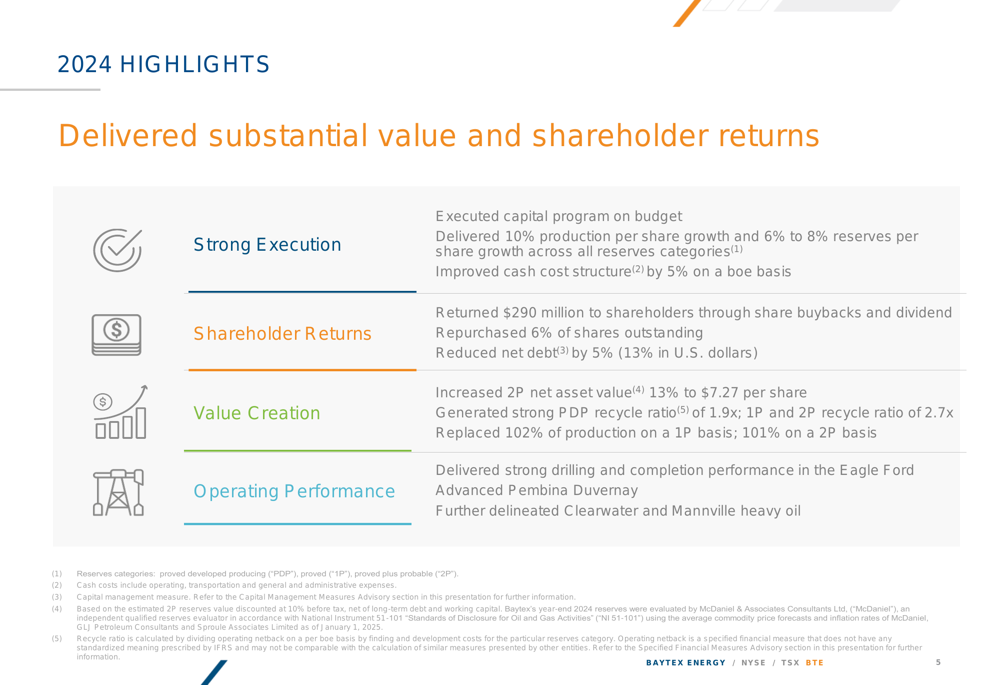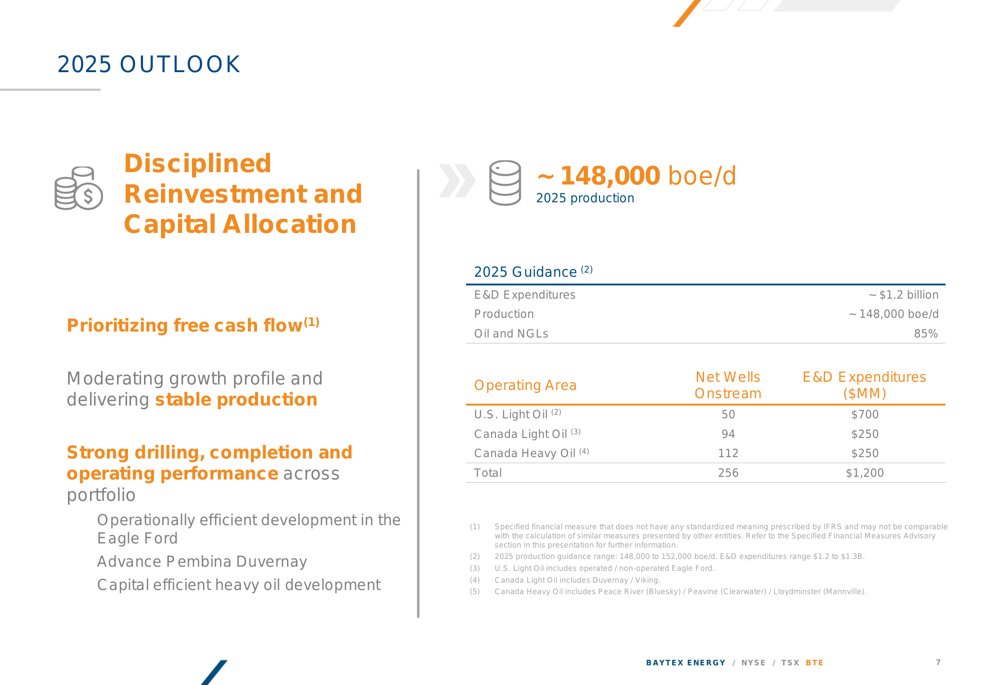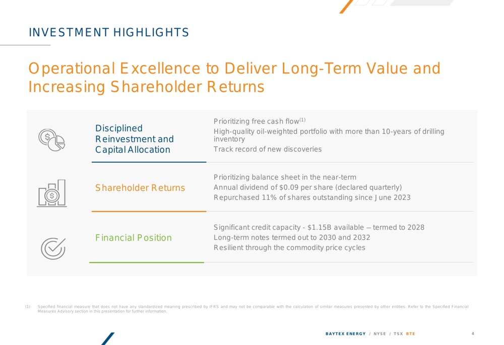 Baytex has outlined three key investment pillars in its presentation: disciplined reinvestment and capital allocation, shareholder returns, and financial strength.