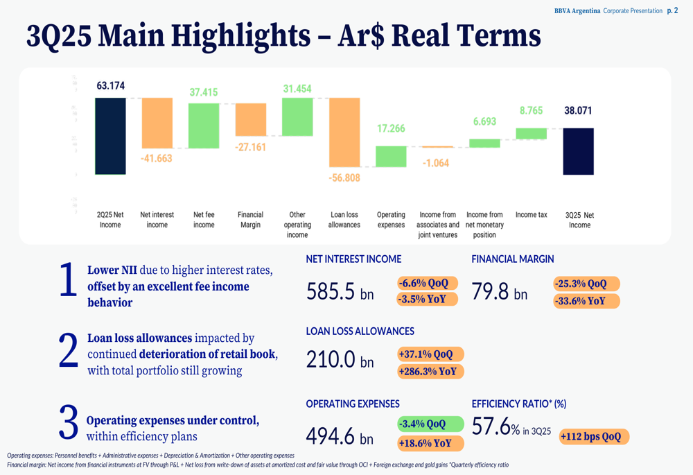BBVA Argentina reported net income of AR$ 38.1 billion for Q3 2025, representing a steep 40% year-over-year decline and a 46% drop from the previous quarter. This performance resulted in an EPS of $0.5049, missing analyst forecasts of $0.6 by 15.85%.