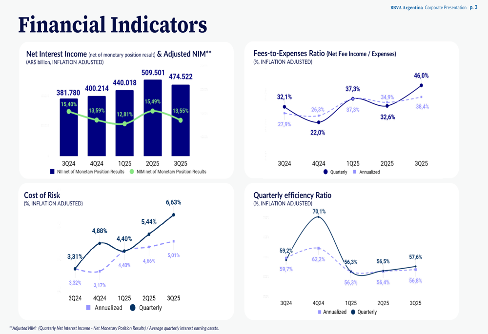 On a positive note, BBVA Argentina continued to gain market share in both loans and deposits. Private deposits market share increased to 10.09% in Q3 2025 from 9.65% in the previous quarter and 8.53% a year earlier. Similarly, private loans market share stood at 11.39%, slightly down from 11.59% in Q2 but still higher than the 10.58% reported a year ago.