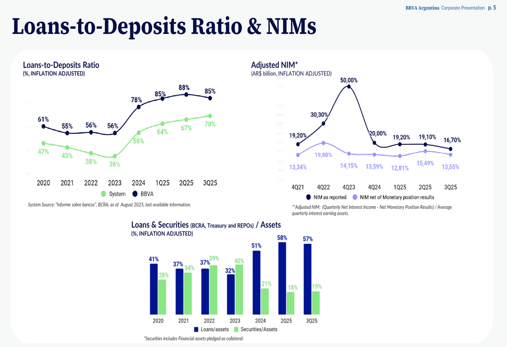 BBVA Argentina’s loans-to-deposits ratio stood at 85% in Q3 2025, slightly down from 88% in the previous quarter but significantly higher than the 61% reported in 2020. This indicates the bank is deploying more of its deposit base into lending activities, potentially improving net interest margins but also increasing risk exposure.