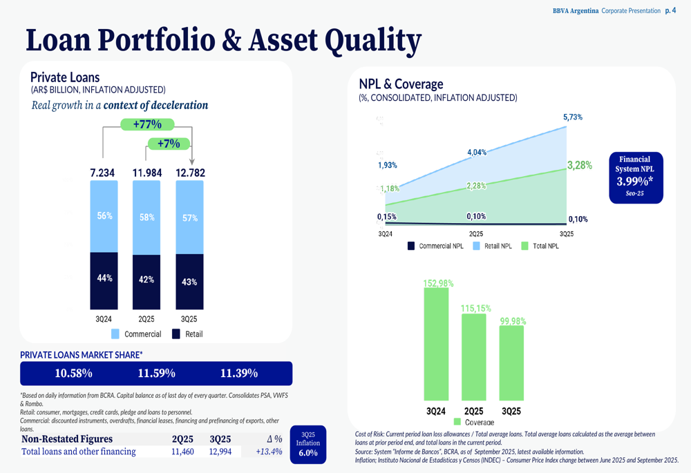 A key concern emerging from the presentation was the deterioration in asset quality. Loan loss allowances surged to AR$ 210.0 billion, representing a 37.1% increase quarter-over-quarter and a dramatic 286.3% rise year-over-year. This significant increase reflects ongoing challenges in the retail loan book.