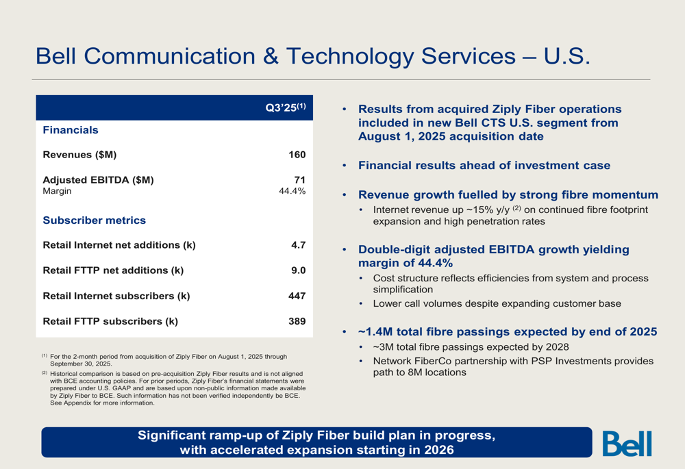 The newly formed U.S. CTS segment, which includes Ziply Fiber operations from the August 1 acquisition date, contributed $160 million in revenue and $71 million in adjusted EBITDA, achieving a 44.4% margin. The segment added 4,700 retail internet subscribers, including 9,000 FTTP net additions.