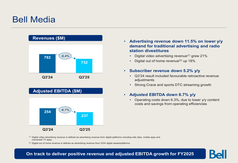Bell Media faced challenges with revenue declining 6.4% to $732 million and adjusted EBITDA falling 6.7% to $237 million year-over-year. Despite these headwinds, the company stated it remains on track to deliver positive revenue and adjusted EBITDA growth for the full fiscal year 2025.