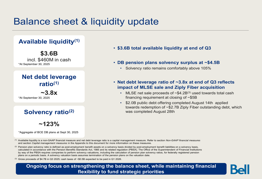 BCE’s balance sheet showed available liquidity of $3.6 billion, including $460 million in cash as of September 30, 2025. The company’s net debt leverage ratio stood at approximately 3.8x, reflecting the impact of both the MLSE sale and Ziply Fiber acquisition. BCE noted that the MLSE net sale proceeds of approximately $4.2 billion were used toward the total cash financing requirement of approximately $5 billion for the Ziply Fiber acquisition.