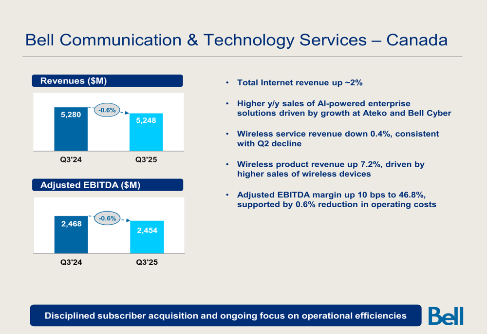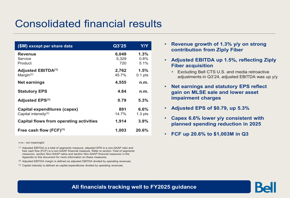 BCE reported consolidated revenue of $6.05 billion for Q3 2025, representing a 1.3% year-over-year increase, though slightly below analyst expectations of $6.09 billion. The company’s adjusted EBITDA grew by 1.5% to $2.76 billion, maintaining a strong margin of 45.7%.