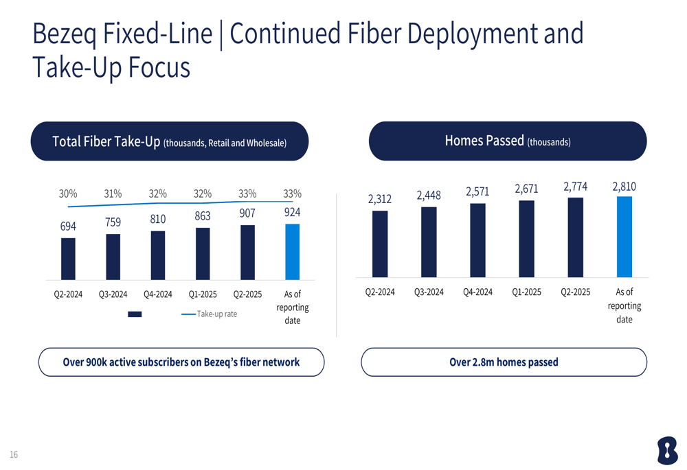 Bezeq’s strategic focus on fiber deployment and 5G expansion continues to drive growth. The company’s fiber network now passes 2.81 million homes with 924,000 subscribers, representing a take-up rate of 33% (targeting 40% mid-term). Retail fiber customers reached 592,000, representing 58% of total retail subscribers.