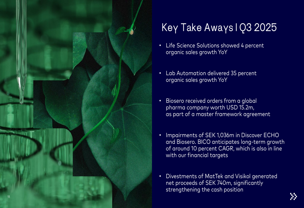 BICO Group AB (STO:BICO) shares surged nearly 15% on Tuesday after the company presented its third-quarter results showing improved sales growth and a significant strengthening of its cash position through strategic divestments. The lab automation specialist reported 12% organic growth and a return to positive adjusted EBITDA margin.