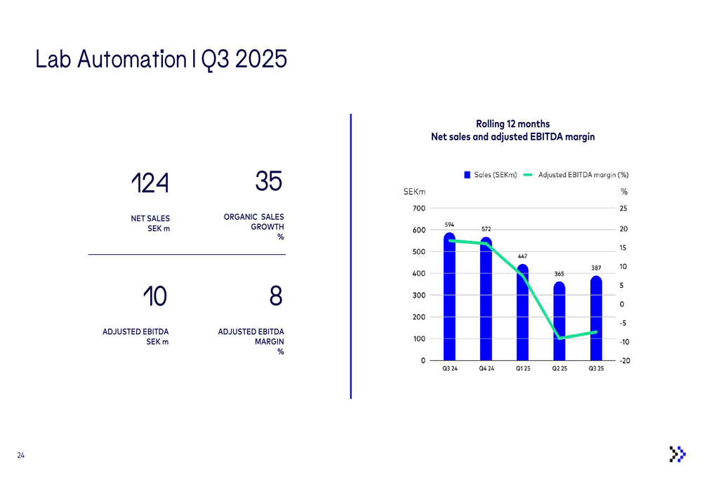 The Lab Automation segment was the standout performer with net sales of SEK 124 million and impressive organic growth of 35% year-over-year. This segment generated an adjusted EBITDA of SEK 10 million, representing an 8% margin.
