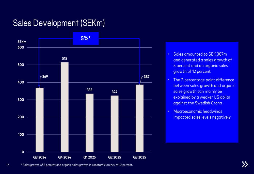 BICO Group reported net sales of SEK 387 million for the third quarter of 2025, representing 5% reported growth and 12% organic growth year-over-year. The 7-percentage point difference was primarily attributed to currency effects from a weaker US dollar against the Swedish krona. The company achieved an adjusted EBITDA of SEK 17 million, corresponding to a 5% margin.