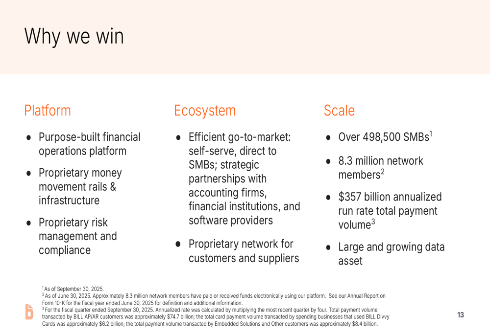 BILL’s presentation outlined several competitive advantages that have contributed to its market position. These include a purpose-built financial operations platform, proprietary money movement infrastructure, and advanced risk management capabilities.