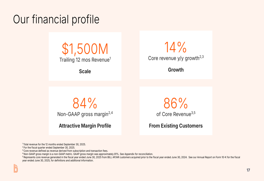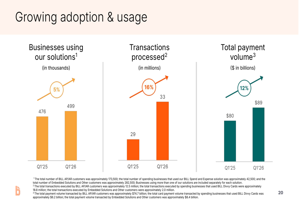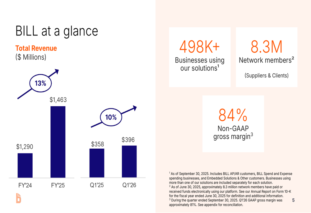 BILL’s at-a-glance metrics showcase its scale in the SMB financial operations market: