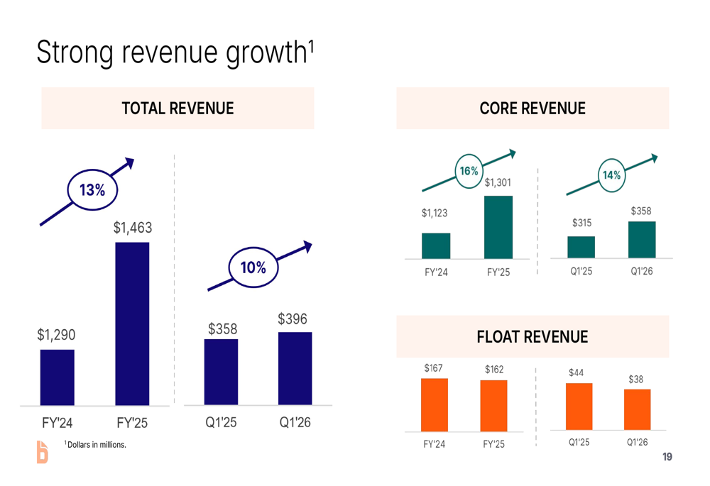 BILL reported total revenue of $396 million for Q1 2026, representing a 10% year-over-year increase from the $358 million reported in Q1 2025. Core revenue, which excludes float revenue, grew at an even stronger pace of 14% year-over-year to reach $358 million.