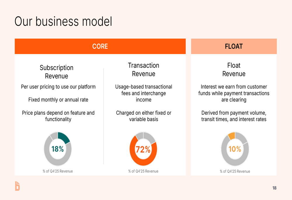 The company’s business model relies primarily on transaction revenue, which accounts for 72% of total revenue, while subscription and float revenue contribute 18% and 10% respectively, as illustrated in this breakdown: