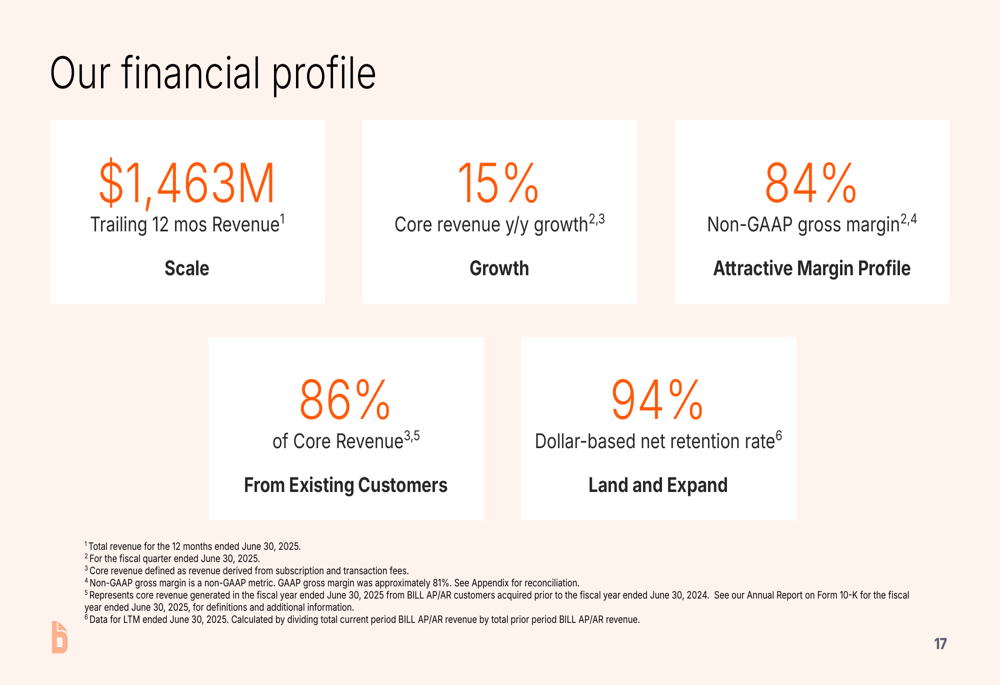 Bill.com maintains a strong financial profile with 84% non-GAAP gross margins and a 94% dollar-based net retention rate. The company has achieved a 49% CAGR in total revenue, demonstrating consistent execution over time.