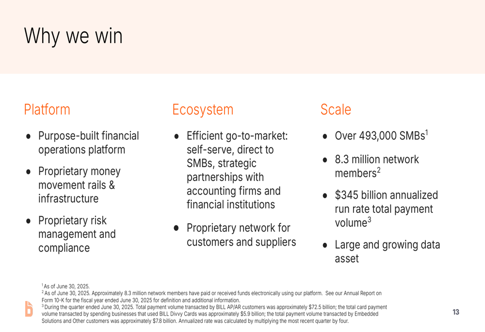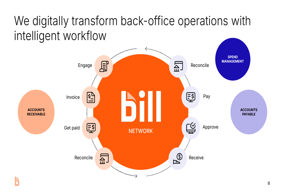 The company positions itself as "Champions of small and midsize businesses" with a mission to "Make it simple to connect and do business." Bill.com’s platform aims to replace legacy paper-based processes with digital solutions for accounts payable, accounts receivable, spend management, and financial planning.