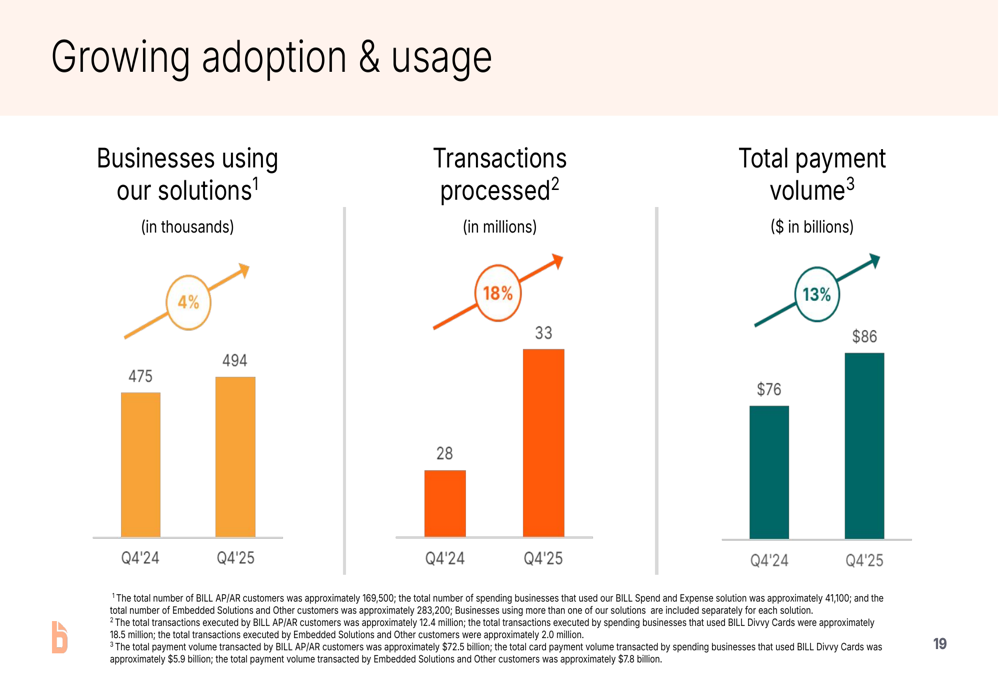 Bill.com continues to expand its customer base and transaction volume. The company now serves over 493,000 businesses, up 4% year-over-year, while transactions processed increased 18% to 33 million in Q4 2025. Total payment volume grew 13% to $86 billion in the same quarter.