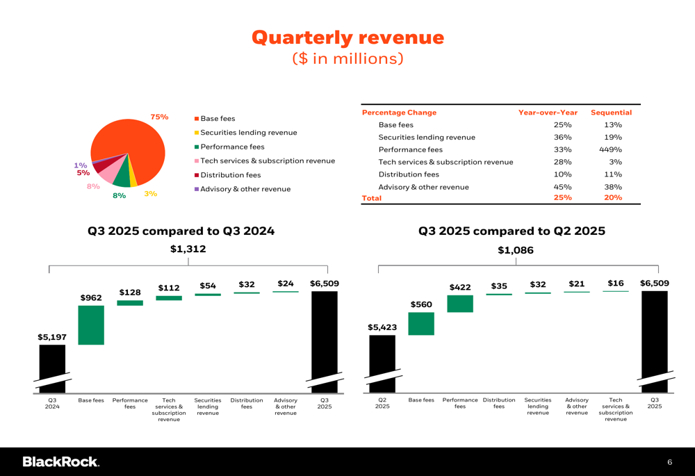 BlackRock’s revenue composition for Q3 2025 shows base fees as the dominant revenue source at 75%, followed by technology services and distribution fees at 8% each, with performance fees contributing 5%: