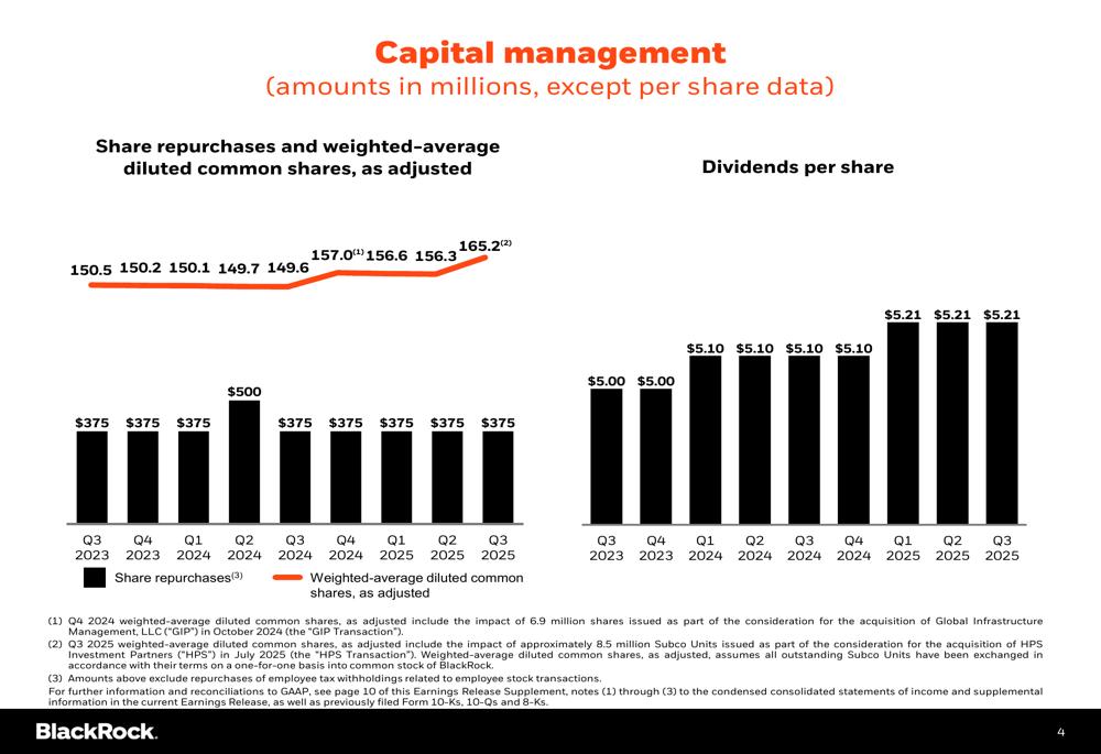 BlackRock has maintained a consistent capital return strategy, with quarterly share repurchases generally at $375 million and steadily increasing dividends: