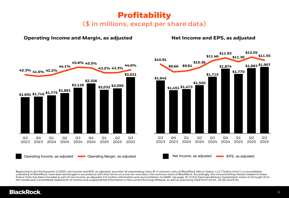 BlackRock reported adjusted earnings per share of $11.55 for Q3 2025, surpassing the forecasted $11.31 and representing a modest increase from $10.91 in Q3 2023. The company’s adjusted operating income reached $2.62 billion, up significantly from $1.69 billion in Q3 2023, while operating margin expanded to 44.6% from 42.3% over the same period.