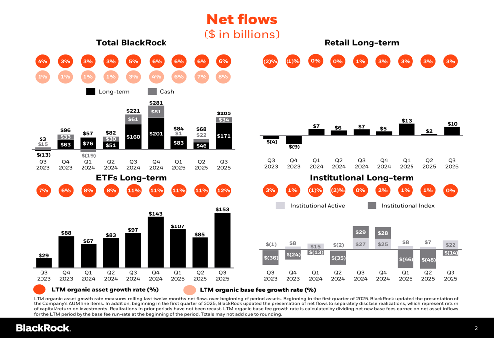 BlackRock’s ETF business continues to be a significant growth driver, with consistently positive net flows ranging from $67 billion to $143 billion per quarter. The company’s long-term organic asset growth rate for ETFs has remained strong at 6-12%: