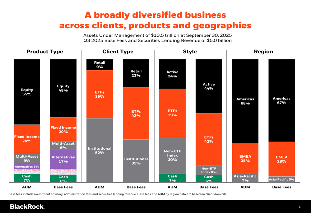 BlackRock’s diversified business model continues to be a key strength, with assets under management distributed across various product types, client segments, and geographic regions: