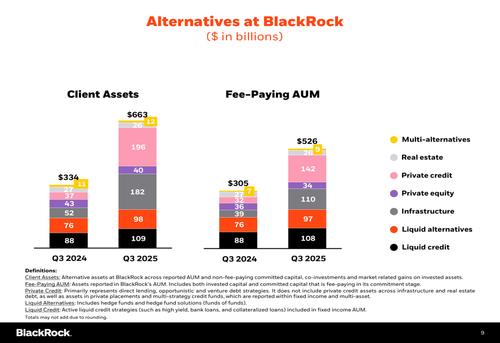 The alternatives business represents another strategic focus area for BlackRock, with $405 billion in client assets across various alternative investment categories: