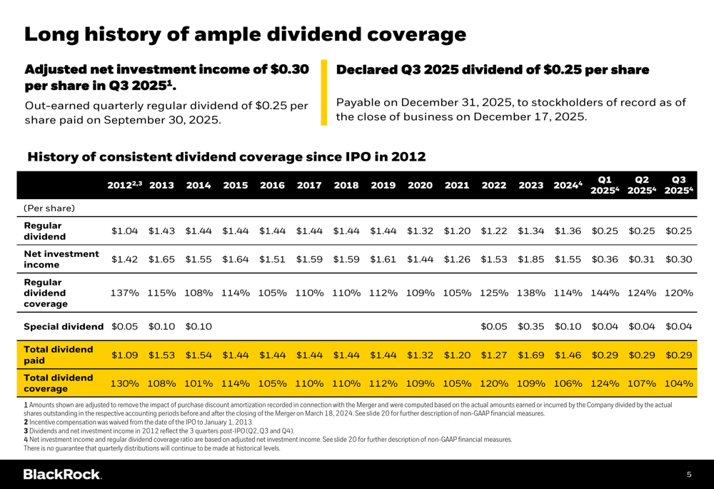 BlackRock TCP Capital reported adjusted net investment income of $0.30 per share for Q3 2025, comfortably covering its regular quarterly dividend of $0.25 per share. The company declared a Q3 dividend payable on December 31, 2025, to stockholders of record as of December 17, 2025.