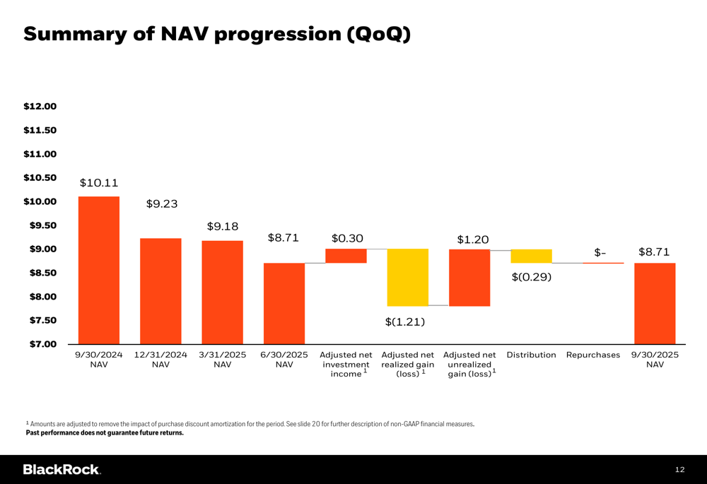 Looking forward, management indicated plans to refinance its 2026 notes and continue resolving challenged portfolio positions. The company's NAV progression over recent quarters shows stabilization after previous declines, suggesting the portfolio repositioning efforts may be gaining traction: