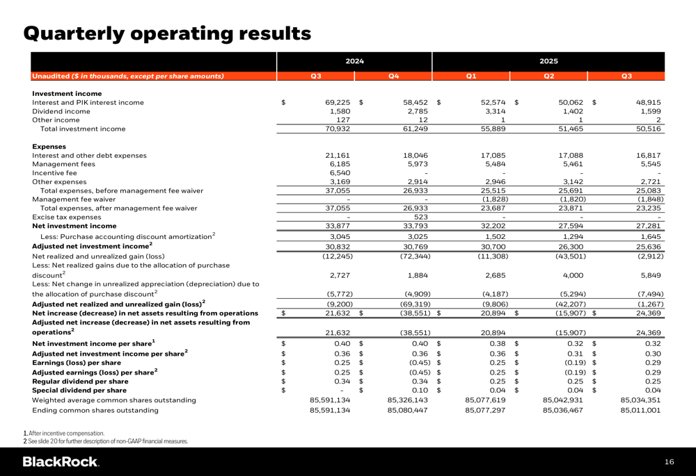 The company's total investment income for Q3 2025 was $50.52 million, with net investment income of $27.28 million. Total expenses were $25.08 million, including interest and debt expenses of $17.02 million. The detailed quarterly operating results demonstrate the company's financial performance: