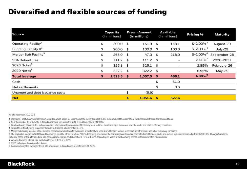 BlackRock TCP Capital maintains a strategically positioned balance sheet with diversified funding sources. As of September 30, 2025, the company had total leverage capacity of $1.52 billion, with $466.1 million available. The weighted average interest rate on outstanding debt was 4.98%.