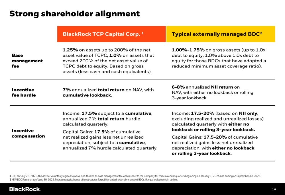 A key competitive advantage for TCPC is its fee structure, which provides strong shareholder alignment compared to typical externally managed BDCs. The company's base management fee is lower than industry averages, and its incentive fee structure includes a higher hurdle rate with a cumulative lookback: