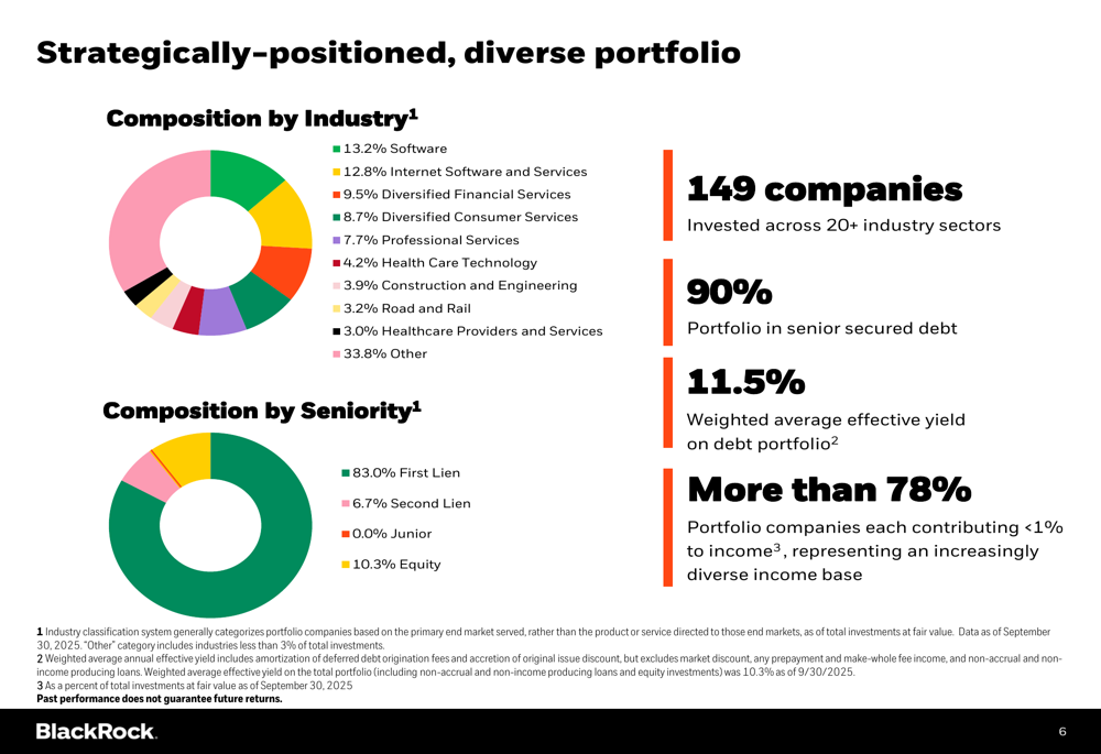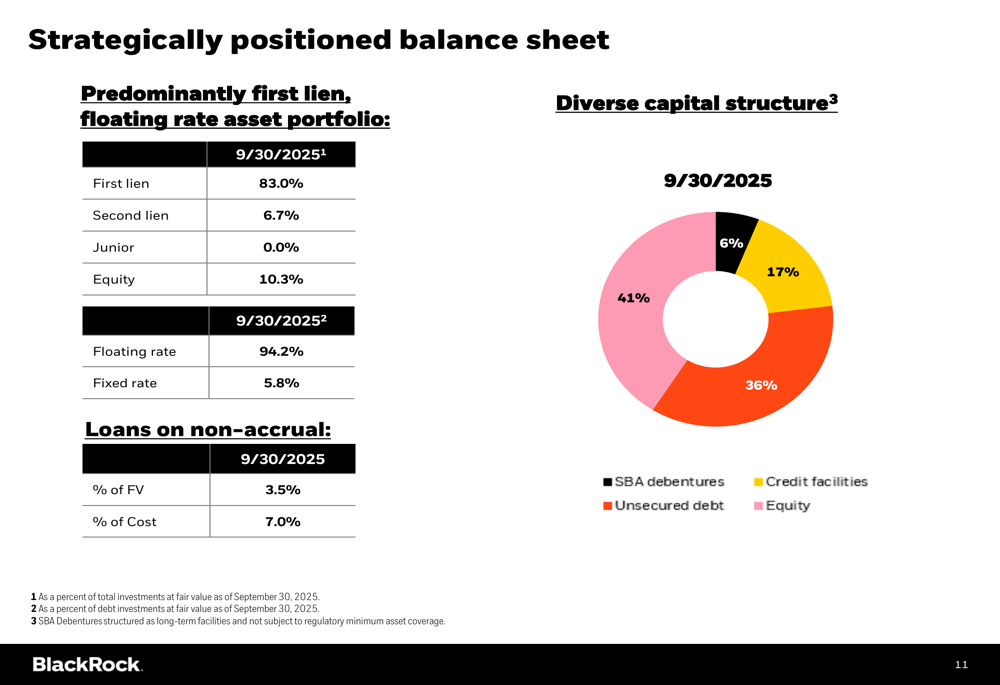 BlackRock TCP Capital continues to focus on its core investment strategy of providing first lien, floating rate loans primarily to middle market borrowers with $25-75 million of EBITDA. The company targets less-cyclical industries including software, financial services, and professional services, seeking companies supported by long-term, sustainable growth drivers and economic resilience.