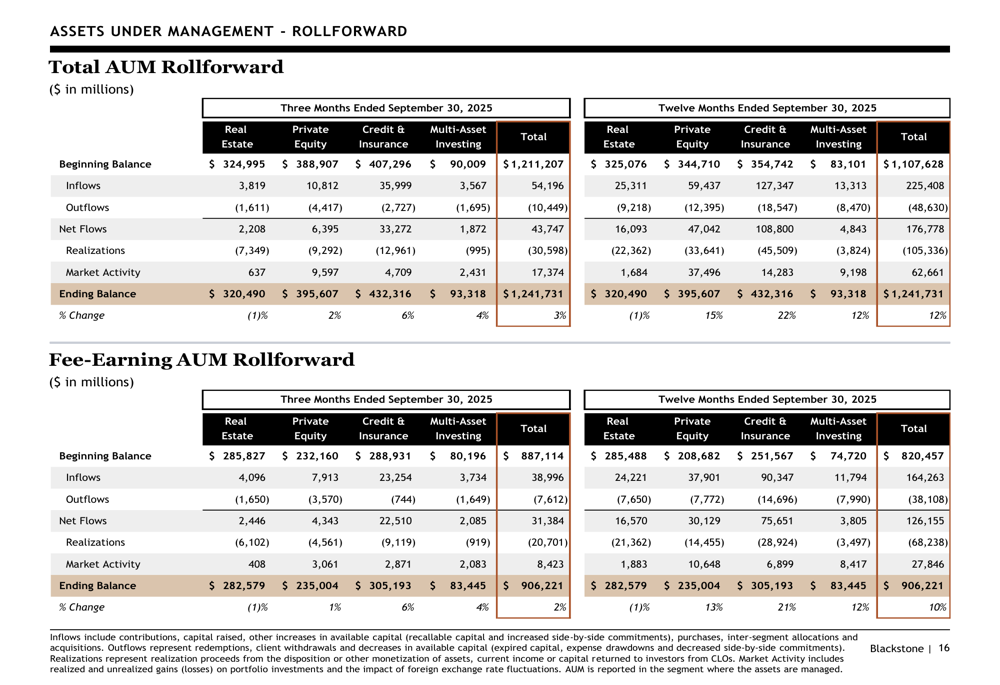 The following chart illustrates the detailed movement in Blackstone’s total AUM, including inflows, outflows, realizations, and market activity: