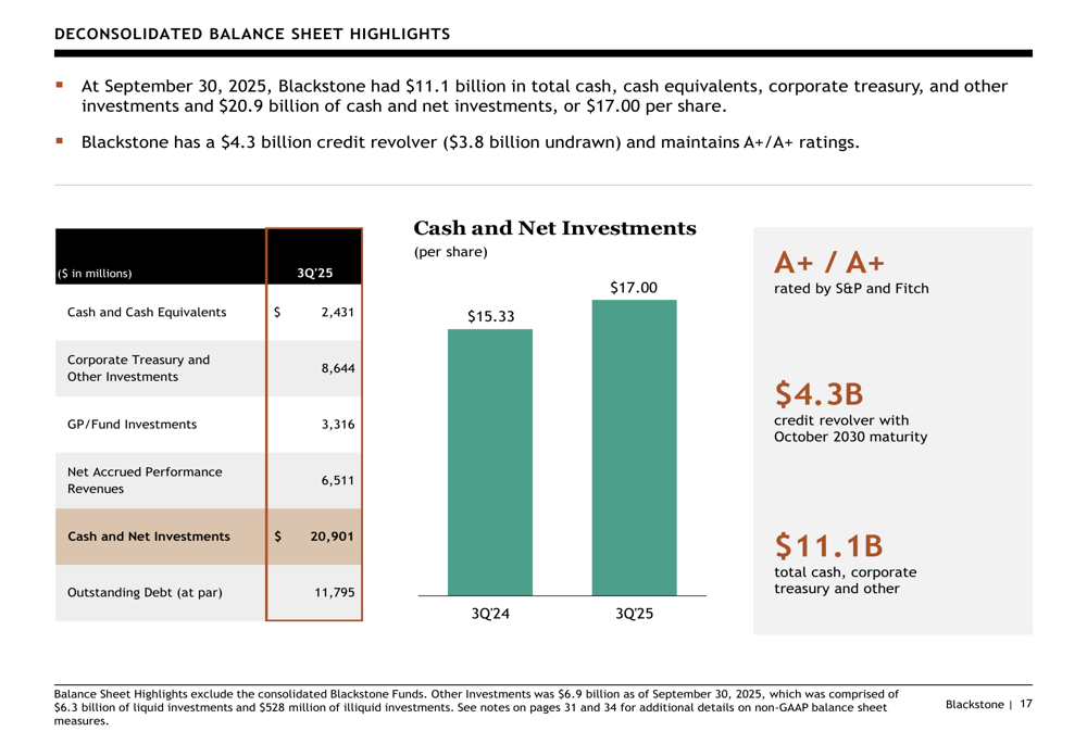 Blackstone declared a quarterly dividend of $1.29 per common share, payable on November 10, 2025, bringing total dividends over the last twelve months to $4.69 per share. The company also continued its share repurchase program, buying back 0.2 million common shares during the quarter.