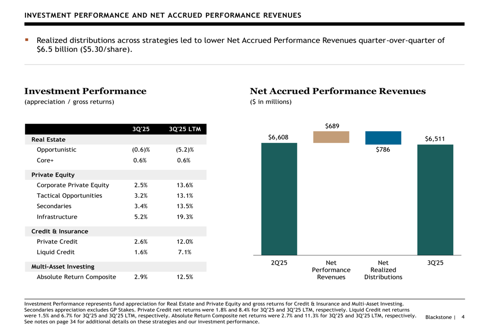 The investment performance across strategies showed mixed results, with realizations leading to slightly lower Net Accrued Performance Revenues quarter-over-quarter: