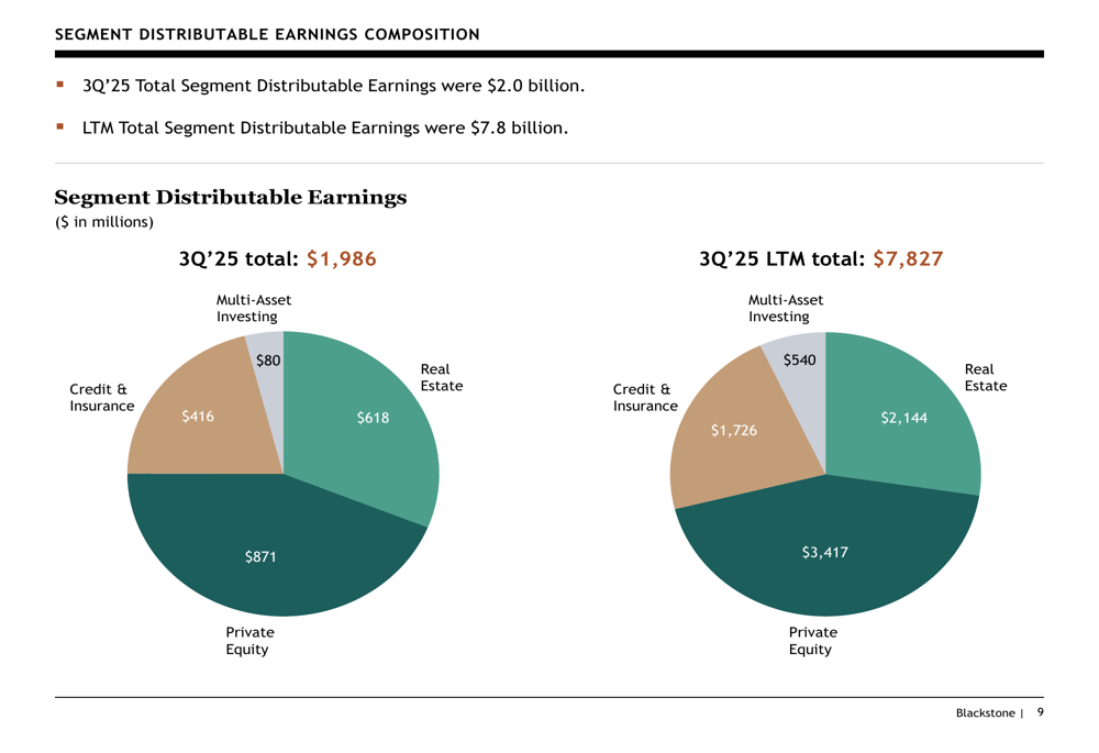 The following segment breakdown shows how distributable earnings were distributed across Blackstone’s business units for both the quarter and the last twelve months: